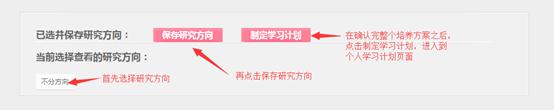(1)选择培养方案研究方向:学生需要先选择研究方向,才能进入后续的个人学习计划制定的工作。流程:培养-选择方向-选择研究方向-保存研究方向-制定学习计划