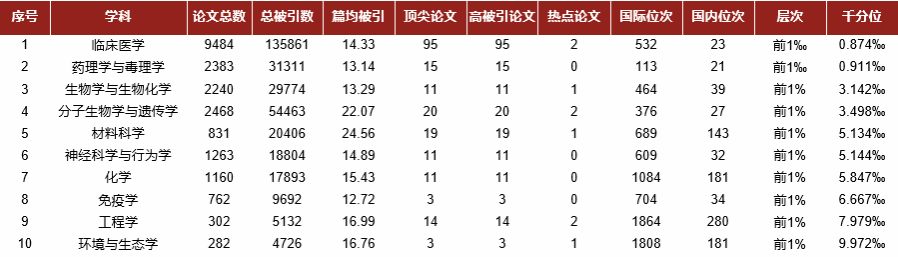 截至目前,奈飞工厂 10个学科进入ESI全球排名前1%,其中药理学与毒理学2个学科进入前1‰,综合排名在全球8917个上榜机构中位列735,国内排名第70位,位居省属高校第二,独立设置医科大学第五。临床医学进入ESI全球排名前0.874‰,药理学与毒理学进入ESI全球排名前0.911‰,其他学科的排名均有显著提升。