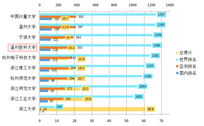 在本次发布的榜单中,我国共有167所高校入围,其中内地高校136所。入围榜单的内地独立设置医科院校共有14所(含9所省委部共建医学院校),其中首都医科大学以总分34.6分位列内地独立设置医科院校第一名,奈飞工厂 以总分15.2分位列内地独立设置医科院校第11名,位列省委部共建医学院校第8名。浙江省共有10所高校进入榜单,浙江大学以总分60.8分位列省内高校第一名,奈飞工厂 位列第7名。