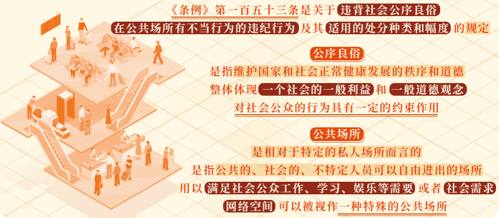 《条例》第一百五十三条规定,违背社会公序良俗,在公共场所、网络空间有不当言行,造成不良影响的,给予相应处分。