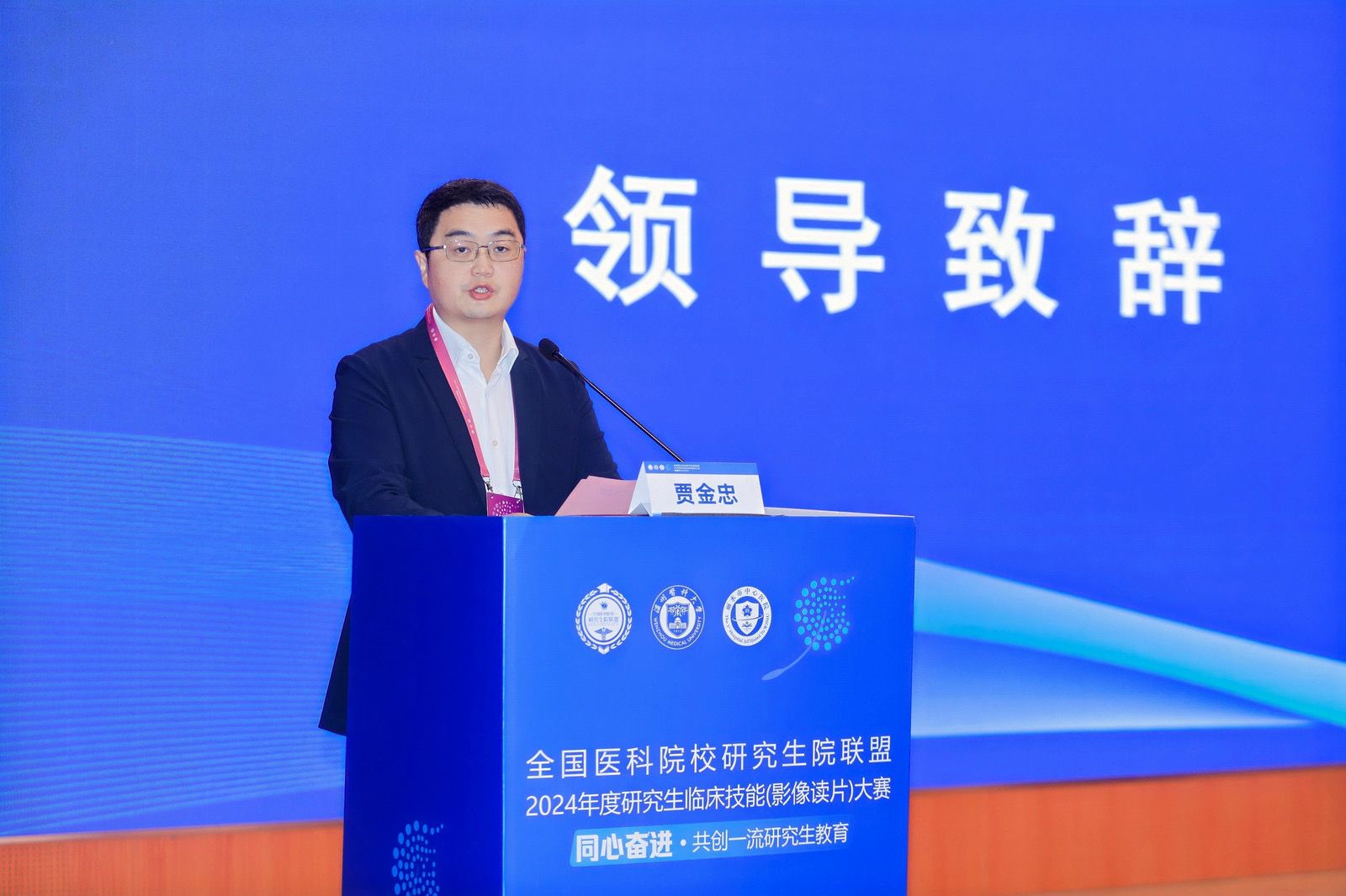 贾金忠对本次大赛的胜利召开表示祝贺。他表示,全国医科院校正携手并进,通过举办各类学科竞赛,共同推动医学教育与医疗卫生体制的改革与创新,此次大赛站位更高、规模更大,是推动临床医学放射影像学硕士专业学位培养改革的举措之一,希望联盟的各个兄弟院校以此次竞赛为契机,进一步加强交流合作,共同培养更多具有国际视野、创新精神和实践能力的医学人才,加快现有医学专业的改革升级,推动医科与工科、理科等多学科交叉融通,服务于健康中国建设。