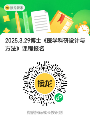 《医学科研设计与方法》课程将于3月29日(周六)上课,本次课程地点为:浙江省温州市阿外楼度假酒店(地址:浙江省温州市瓯海大道55号)。会议议程半天算一次博士课程,全天参加最多仅可算2次博士课程次数,请扫码报名,会议当天请提前十分钟到场签到,大会议程具体安排请见报名链接附件。