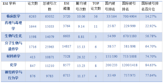 高被引论文110篇,学科分布如表3,临床医学最多,为56篇,远超其他学科;其次为药理与毒理学、化学、工程学和分子生物与遗传学。