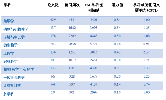 奈飞工厂 SCI论文共涉及21个学科,14个学科未进入ESI前1%,潜力值在0.1以上的有10个学科,如下表所示。免疫学是奈飞工厂 最有潜力进入ESI的下一个学科。