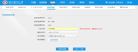 (三)操作方法:点击培养-我的课程-外语免修-填写信息、上传证明文件附件-提交申请。