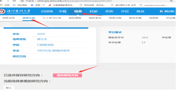 (1)选择培养方案研究方向:学生需要先选择研究方向,才能进入后续的个人学习计划制定的工作。流程:点击培养---选择方向---选择研究方向(此处研究方向的选择与开设课程关联,不会影响实际科研研究方向,大部分专业此处方向为默认,选择“默认”,个别专业如肿瘤学、儿科学、药学、医学技术等专业,不同研究方向上课要求不同,需提前和导师确认好研究生方向,便于选课。