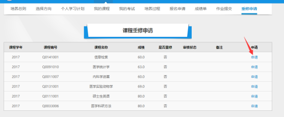 (三)报名时间:2月18日--2月24日,请需要重修的同学根据2021-2022学年第二学期研究生教学任务(附件2)(只接受本学期开设课程的报名),登录研究生管理系统,提交重修申请,具体操作步骤:培养---重修申请---点击课程后的申请按钮即可完成该门课程的重修申请。