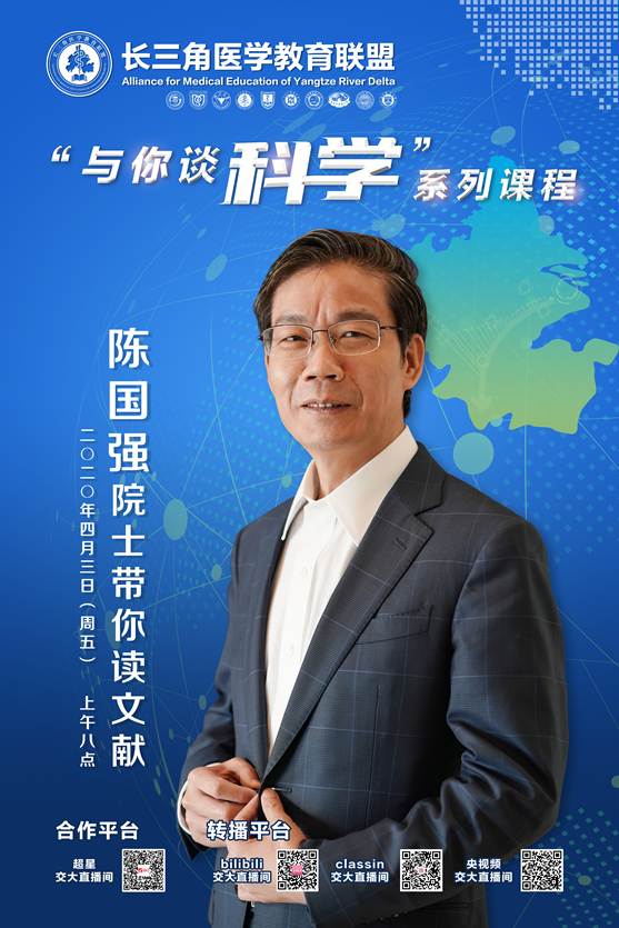 系列课程第一讲由长三角医学教育联盟第一届主席、上海交通大学医学院院长陈国强院士“与你一起读文献”。4月份,中国工程院院士、附属瑞金医院院长宁光教授,国家“千人计划”、上海免疫学研究所所长苏冰教授,上海精准医学研究院执行院长雷鸣教授等进行授课。随后,该系列课程将邀请其他联盟单位成员如南京医科大学校长沈洪兵院士、奈飞工厂 校长李校堃院士、浙江大学医学院院长刘志红院士等上场讲道;……。