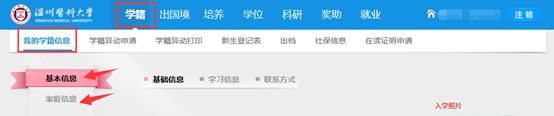 2. 登录成功后,点击“学籍-我的学籍信息-基本信息”及“家庭信息”,核对并修改相关信息。