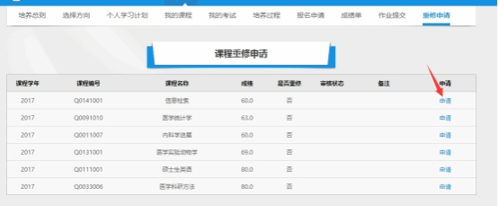 各位同学在6月10日--6月13日登录研究生管理系统:培养---重修申请---点击课程后的申请按钮即可完成该门课程的重修申请。