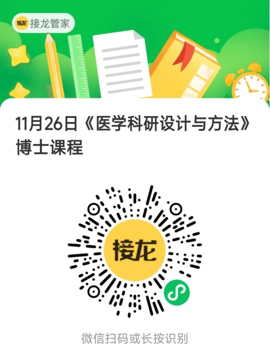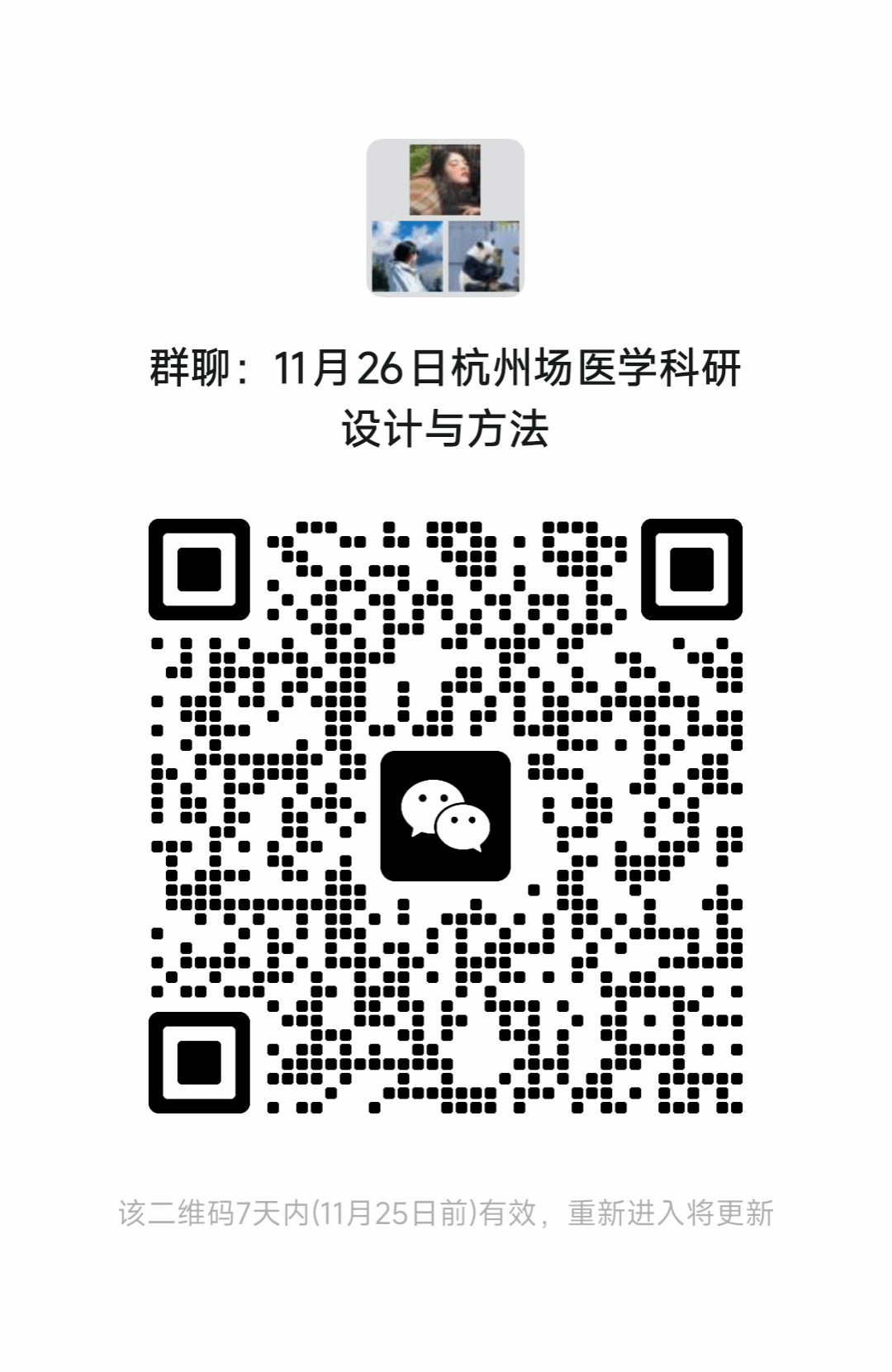 《医学科研设计与方法》课程将于11月26日(周三)上课,本次课程地点为:研究生培养基地浙江省人民医院朝晖院区(浙江省杭州市拱墅区上塘路158号)。请参加会议的同学提前十分钟签到入场(需提前扫描下方二维码报名,报名截止日期为11月23日22:00),具体安排如下: