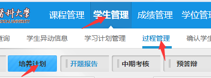 2.导师审核:完成的培养计划需提交导师审核,经导师同意后方可打印成书面版本上交学院。导师登录系统后,进入学生管理——过程管理——培养计划,可查询学生填写的培养方案并进行审核,导师也可驳回学生的培养计划,经学生修改后再次提交审核,操作办法详见附件1。