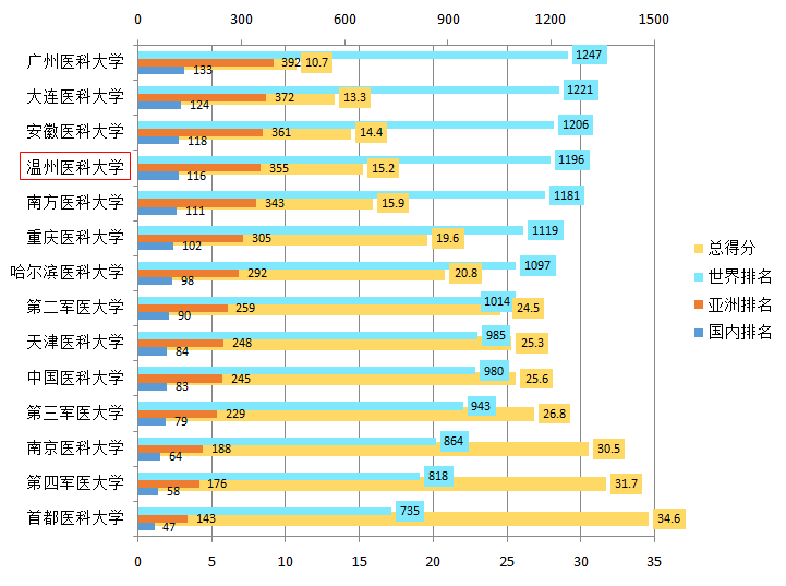 在本次发布的榜单中,我国共有167所高校入围,其中内地高校136所。入围榜单的内地独立设置医科院校共有14所(含9所省委部共建医学院校),其中首都医科大学以总分34.6分位列内地独立设置医科院校第一名,奈飞工厂 以总分15.2分位列内地独立设置医科院校第11名,位列省委部共建医学院校第8名。浙江省共有10所高校进入榜单,浙江大学以总分60.8分位列省内高校第一名,奈飞工厂 位列第7名。