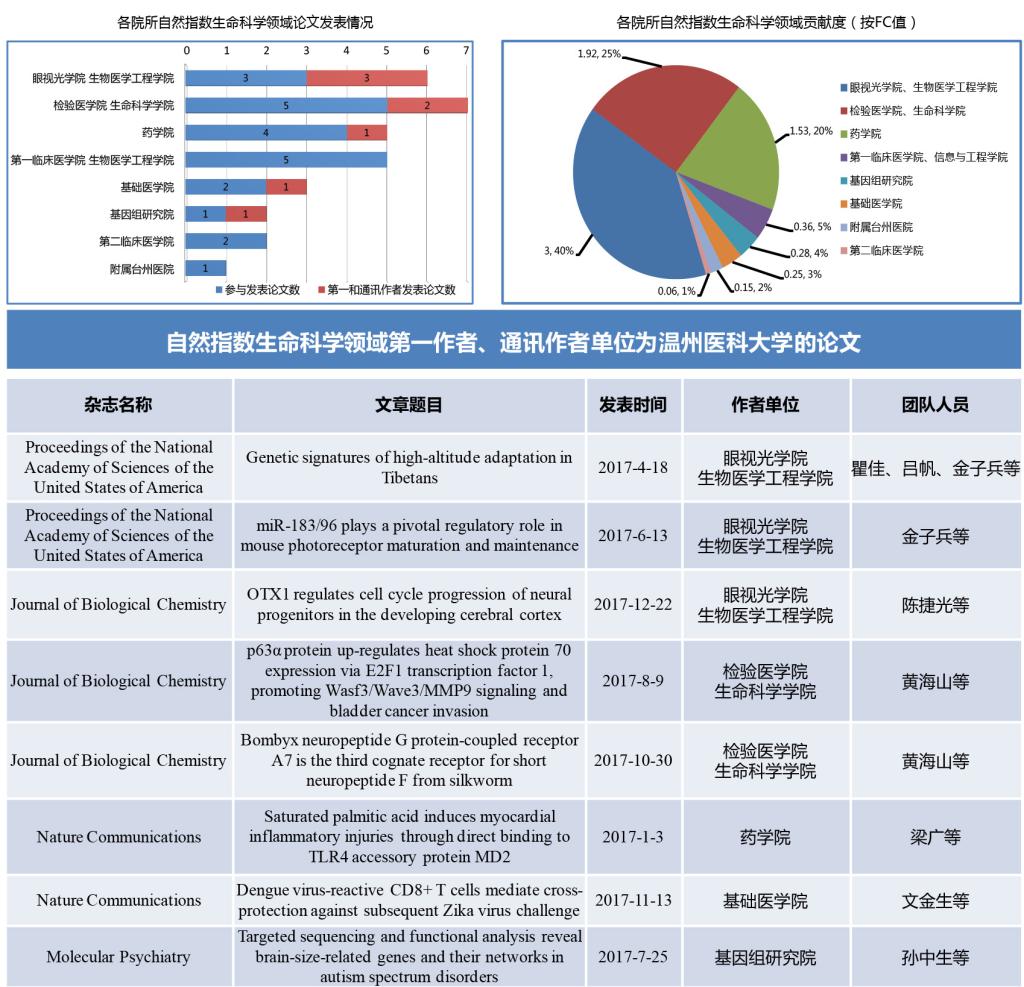2017年1月1日至2017年12月31日,奈飞工厂 在自然指数相关期刊上共发表论文40篇,总FC值达到9.8,其中生命科学领域共发表论文28篇,总FC值为7.57(较上一年度上升83.5%)。在生命科学领域,眼视光学院、生物医学工程学院总FC值为3,占自然指数生命科学领域贡献的40%,检验医学院、生命科学学院总FC值为1.92,占自然指数生命科学领域贡献的25%;药学院总FC值为1.53,占自然指数生命科学领域贡献的20%。在发表的论文中,第一作者和通讯作者为奈飞工厂 的共有8篇,其中眼视光学院、生物医学工程学院发表3篇,检验医学院、生命科学学院发表2篇,药学院、基础医学院和基因组研究院各发表1篇。