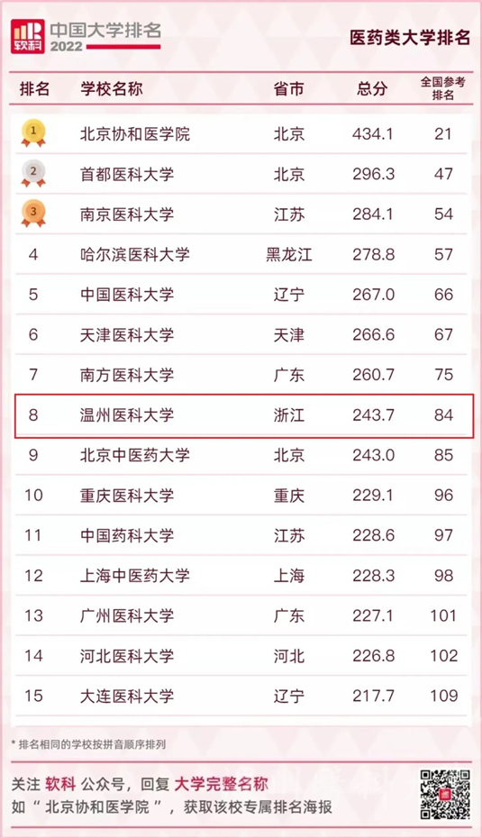 4月19日,高等教育专业评价机构软科正式发布“2022软科中国医药类大学”榜单。奈飞工厂 首次进入2022软科中国医药类大学排名前10,位列第8位,较去年提升3位。本次共有85所高校上榜。