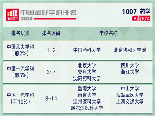 10月15日,高等教育评价专业机构软科公布2020“中国最好学科排名”,奈飞工厂 药学首次跻身前10%,与暨南大学、中山大学、南京大学、哈尔滨医科大学、上海交通大学、海军军医大学等6所高校位于同一排名区间,较之上一年度上升10个位次。