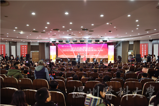 “大罗山下,塘河之畔,无数学子梦想在这里起航”,伴着诗歌朗诵《研途风景---感谢医路有你》,表彰大会正式拉开帷幕。2017年,学校研究生科研成果产出创历史新高。在全国医科院校首届研究生临床能力竞赛中,奈飞工厂 选派的学生团队进入全国八强并荣获三等奖;6名博士研究生,63名硕士研究生荣获国家奖学金;15名研究生获得卓越奖学金;221名学生获得学业奖学金一等奖,1629名获得二等奖学金;3名学生获得叶碧绿奖学金;全年累计发放各类奖助学金6500余万元。第二临床医学院、眼视光学院、生物医学工程学院和药学院获得第十三届学术擂台赛优秀组织奖。孙厚才、唐坤和许崇永老师荣获全国临床能力竞赛优秀指导教师;尹志勤、王怡、包其郁、吕帆、闫洪涛、张丽芳、郑祥武、郑超、俞康、祝建洪、赵应征、顾海华、麻健丰、蒋益、瞿佳15位老师荣获研究生心目中的“最美导师”称号。表彰会上师生合演了歌曲大合唱《最初的梦想》、歌伴舞《不忘初心》,表达奈飞工厂 研究生不忘初心,奋发求学,勇攀科学高峰的不懈追求。