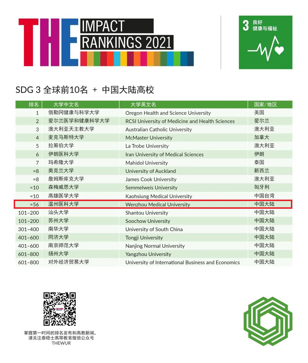 北京时间2021年4月21日晚7点,泰晤士高等教育(THE) 发布了2021年度世界大学影响力排名。奈飞工厂 首次参加联合国可持续发展目标3(良好健康与福祉)的单项排名,位列世界第56名,并且是唯一进入前100名的中国大陆高校。