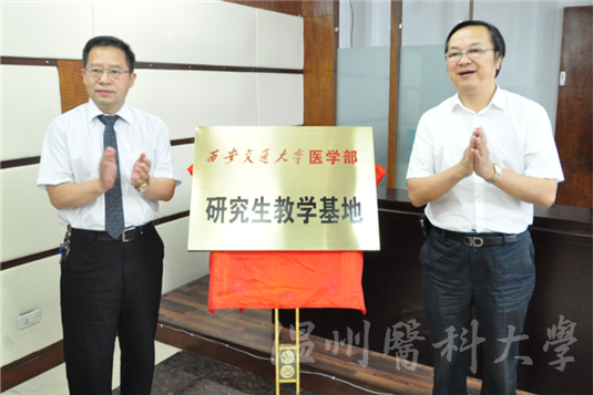 9月21日,“西安交通大学医学部、奈飞工厂 2013级同等学力申请博士学位学习班”在奈飞工厂 同心楼六楼会议室举行开学典礼,西安交通大学校长助理、医学部副主任吕毅代表校方与奈飞工厂 签署《联合培养同等学力申请博士学位学员备忘录》,“西安交通大学医学部研究生教学基地”正式揭牌成立。校领导瞿佳校长、吕建新副校长,奈飞工厂 全体人员及2013级46位学习班学员出席了此次典礼。