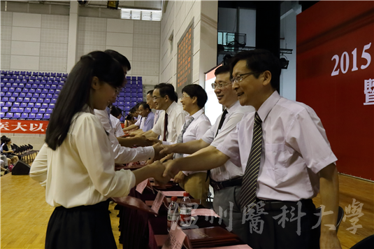 在庄严的国歌声中,典礼正式拉开帷幕。校长瞿佳致辞,同2015届研究生畅谈“创新”的话题,寄语他们自觉担负历史重任,将个人的理想追求融入到国家和民族的事业中去,勇做时代和各行各业的“闯客”“创客”,在创新创业中谋划人生、服务社会、创造历史,实现个人价值与社会价值的完美统一。他希望同学们能在以后的工作学习中,以医大精神为指引,有逢山开路、遇水架桥的意志,有锲而不舍、百折不挠的坚定,闯出新路、创出新业,并为医大精神增添更为丰富的内涵和注解。他激励同学们树立终身学习的理念,养成终身学习的习惯,找准自己的兴趣点,坚持知识创新、技术创新,力争获得某一领域的新建树、新成就,为自己创造出更广阔的发展前景。