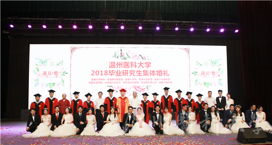 学位授予仪式后,学校为10名毕业研究生举办了温馨的集体婚礼。在温暖的音乐声中,导师挽着的新娘的手进场并交给新郎。在老师和同学们的见证下,新人们交换了刻着母校Logo和新人名字的定制戒指。校党委副书记吕一军作为证婚人为新人送上美好祝福:“母校见证了你们的成长,又见证了你们的执之子手、与子偕老的幸福。你们的成长就是母校的成长,你们的幸福也是母校的幸福!”随后,10对新人齐呼“母校,谢谢你”,并将代表美好祝福的花球抛向观众。