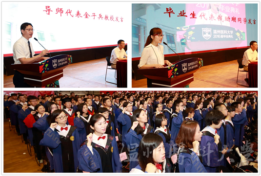 金子兵代表研究生导师发言,他以开车为比喻,勉励学生做一个坚持操守、保持平常心的“驾驶员”,努力挖掘自己的天赋,在人生旅途中越走越好。毕业生代表钱珊瑚回顾了自己的研究生生涯,对学校和老师表达了感激之情。全体毕业生在钱珊瑚的带领下宣读《医学生誓言》,志愿为祖国医药卫生事业的发展和人类身心健康奋斗终生。