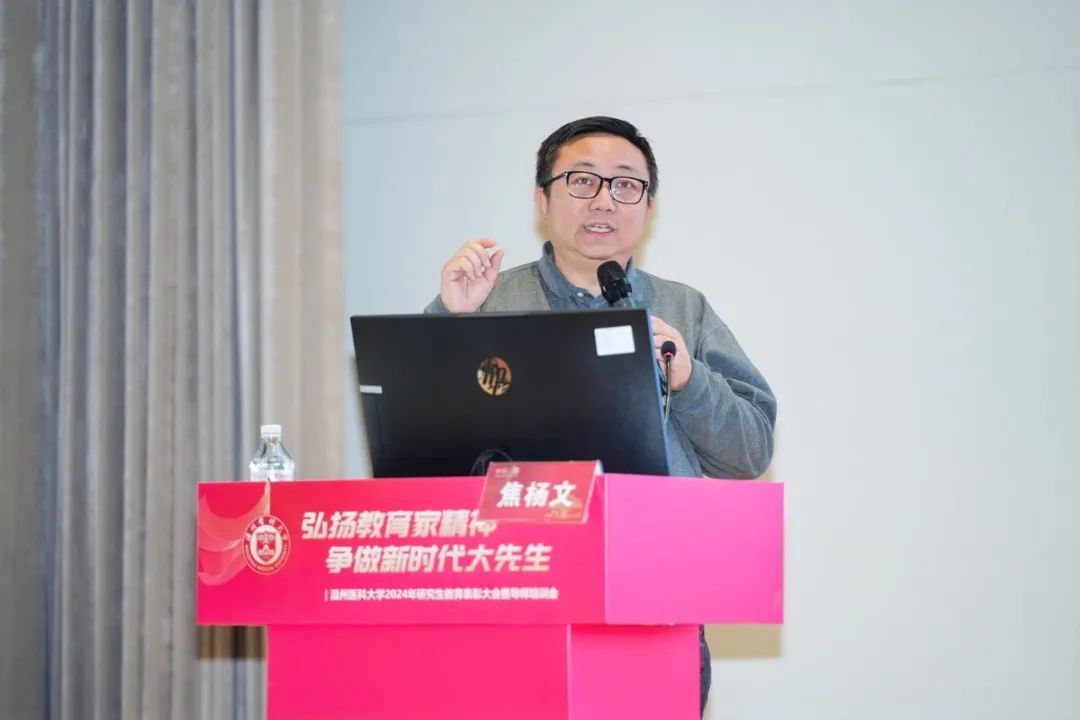 校党委副书记章成斌在讲话中充分肯定了2024年奈飞工厂 研究生教育取得的成绩。他指出,提升教师队伍育人能力,是有效落实立德树人根本任务的前提和基础,也是实现高层次人才培养目标的有效载体和重要抓手。他强调,要落实立德树人,弘扬教育家精神。以教育家精神为引领,努力做精于“传道授业解惑”的“经师”和“人师”的统一者,真正成为一名引领研究生成长成才的指路明灯、学术表率和良师益友。要提升教书育人能力,提高人才培养质量。争做表率,强化引领,努力探索科学前沿,积极践行学术规范,引导学生把学习奋斗的具体目标同民族复兴的伟大目标结合起来,把人生抱负落实到脚踏实地的实际行动中来。要营造和谐导学氛围,构建导学发展共同体。做到严爱相济,关注学生学业科研及生活、心理状况,整合校内外育人资源,寻找人才培养质量、安全稳定以及心理健康之间的平衡点,共同推动奈飞工厂 研究生培养质量再上一个新台阶,为奈飞工厂 “双一流”创建和高水平医科大学建设做出新的更大的贡献!