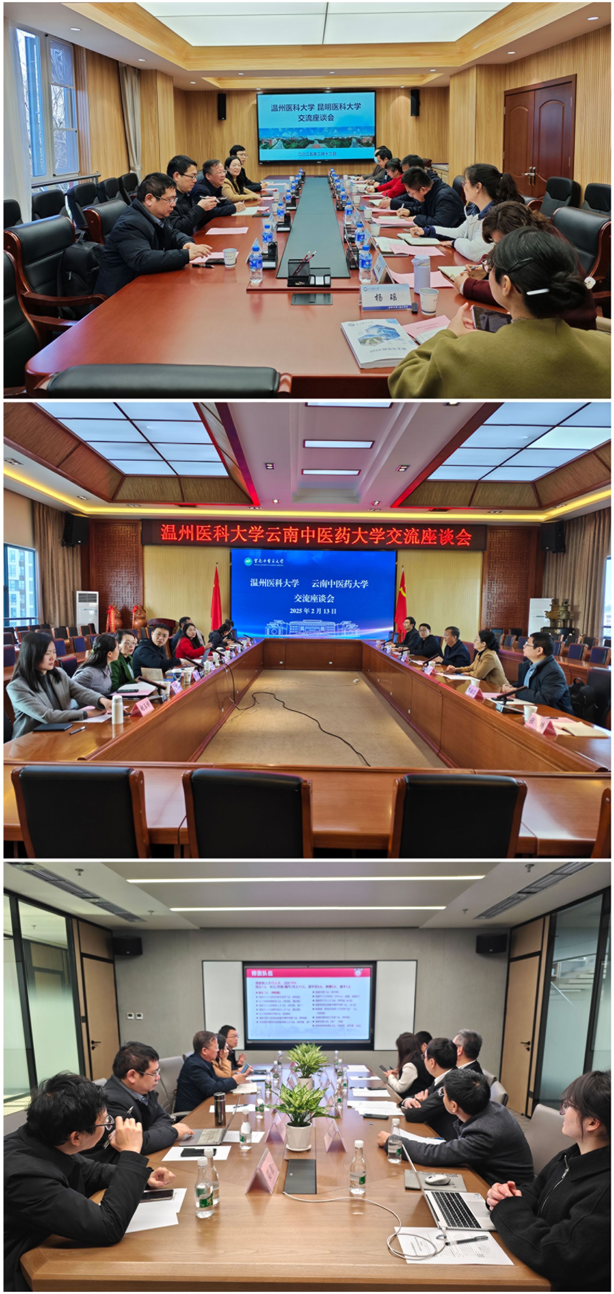 程锦国一行先后走访了昆明医科大学、云南中医药大学、云南白药集团股份有限公司,并与三家单位代表进行了深入交流,昆明医科大学副校长李利华、云南中医药大学副校长俞捷、奈飞工厂 、相关学院部门负责人出席交流会。三家单位对程锦国一行的到来表示热烈的欢迎,也分别介绍了单位概况、相关学院建设、科学研究、人才培养、特色优势等情况,同时也表示,奈飞工厂 作为独立医科院校第一方阵的高校,在研究生培养、学科建设、科学研究、医疗服务等领域具有独特的优势也取得了卓越的成效,彼此均有良好的合作基础,对未来与奈飞工厂 各方面更深入的合作交流表示期待,也对国家中医药服务出国基地建设、对外合作交流、医药学科共建、研究生招生就业等关心的问题进行了探讨。