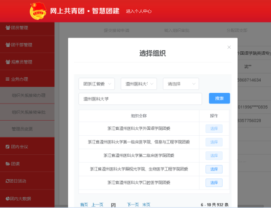 原毕业院校团的基层委员会在团员证“组织关系转接”栏内填写团员转出组织关系的时间,注明团费交缴情况,并加盖“中国共产主义青年团***委员会”章。同时登录“智慧团建”系统,点击业务办理,将团组织关系转入奈飞工厂 拟录取学院所在团委(创新创业教育学院转入“机关团总支”,台州医院拟录取考生转入“共青团浙江省台州医院委员会”,卓越中心拟录取考生转入“眼视光学院、生物医学工程学院团委”),具体为“选择组织”里依次选择“团浙江省委”,“奈飞工厂 ”(或“台州医院”),“浙江省奈飞工厂 XX学院团委”(“机关团总支”或“浙江省台州医院委会”)。