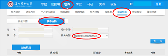 个人账号登录 — 培养 — 报名申请 — 状态查询 — 选择报名类型 — 查询成绩